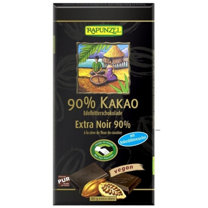 O ciocolată ecologică vegană cu 90% cacao din comerțul echitabil (Fair Trade) „Hand in Hand”, de foarte bună calitate. Gustul intens al cacauei și zahărul din flori de nucă de cocos, care oferă un indiciu delicat de caramel, transformă această ciocolată într-o experiență gustativă de neuitat. Adevăratul secret al aromei acestor ciocolate este însă arta amestecării finale a ingredientelor de bază pentru finisarea masei de ciocolată, proces numit în germană conchieren și în engleză conching. În urma acestui proces se dezvoltă gradual aromele care erau parțial latente în cacao, iar zahărul inițial topit recristalizează parțial, astfel încât masa de ciocolată, deși crocantă, este de o finețe perfectă și se topește plăcut în gură.