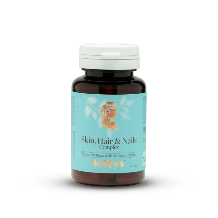Skin, Hair & Nails Complex de la Kotys este un supliment alimentar complex, formulat pentru susținerea sănătății pielii, părului și unghiilor, printr-un aport echilibrat de vitamine, minerale și compuși activi.