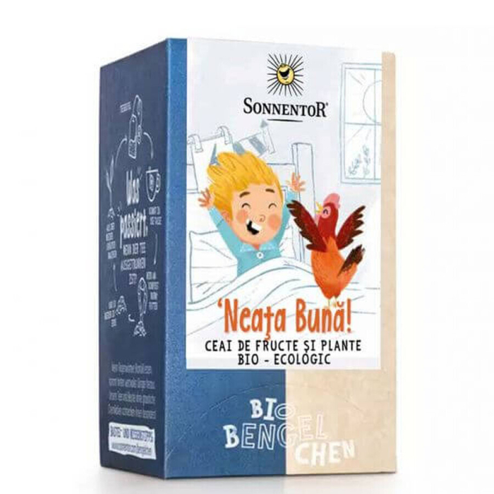 Ceaiul "Îngerașii ștrengari - Neața bună" de la Sonnentor este un ceai bio din fructe și plante, conceput pentru a începe ziua plin de energie, cu un gust revigorant, fructat, de la ingrediente precum măceșe, gutui, hibiscus, roiniță, lămâiță, petale de trandafiri, albăstrele și izmă bună.