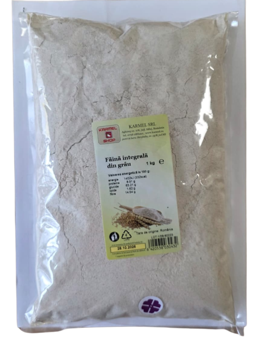 Făina de grâu integrală este superioară nutrițional celei albe datorită conținutului ridicat de fibre, vitamine (complex B, E, K) și minerale (magneziu, fier, fosfor). Este bogată în carbohidrați complecși și proteine, având un indice glicemic mai mic, fiind ideală pentru pâine, paste și produse de patiserie mai sănătoase.